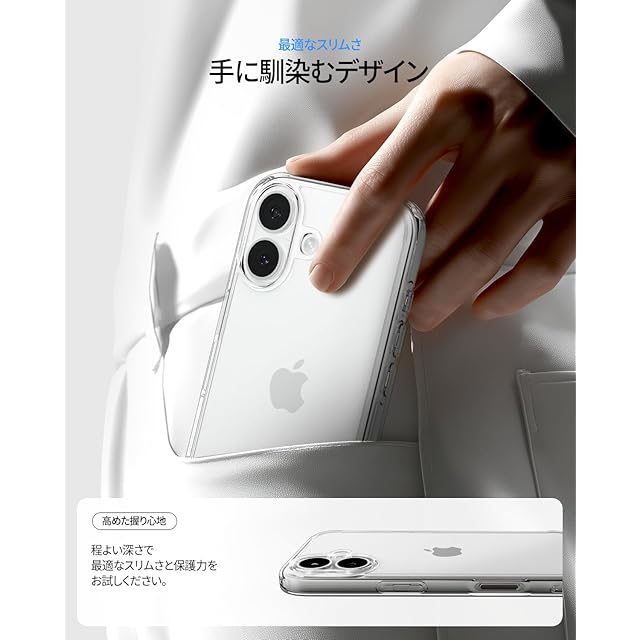 【高耐久のクリア素材】装脱着が簡単になる柔らかいTPU(熱可塑性ポリウレタン)に丈夫なPC(ポリカーボネート)をハイブリッドさせた2重構造でデバイスを守ります。背面のPCにはUVコーティング、側面のTPUには青いレジンを活用した新素材「デュラクリア」を使い、黄変を最小限に抑制しました。