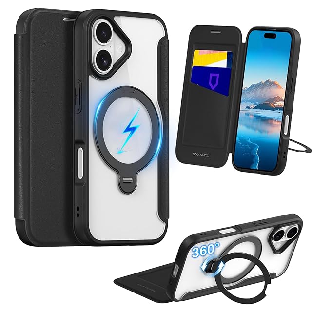 Fadkzyxr iPhone 17 用 ケース 手帳型 カード収納 MagSafe対応 リング付き 360°回転スタンド 縦横両対応 いphone17 スマホケース レザー素材 軽い 薄型 耐衝撃 全面保護 アイフォン17 携帯カバー マグセーフ対応 おしゃれ-ブラック