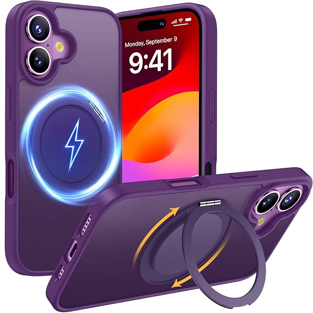 Aunote iphone 17ケース MagSafe対応 耐衝撃 360°回転スタンド 縦横両対応 マグネット搭載 黄変防止 マット感 iphone17 カバー 6.3インチ 半透明・パープル