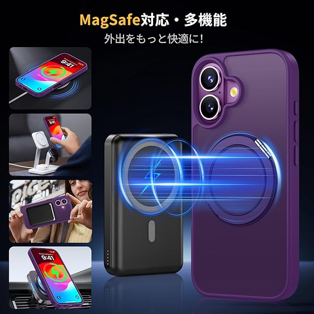 商品名:Aunote iphone 17ケース MagSafe対応 耐衝撃 360°回転スタンド 縦横両対応 マグネット搭載 黄変防止 マット感 iphone17 カバー 6.3インチ 半透明・パープル