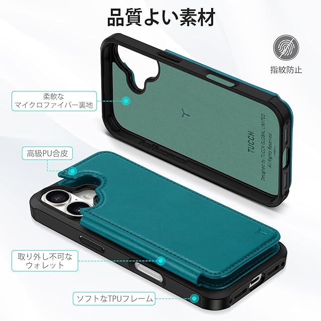 商品名:TUCCH iPhone 17 対応 ケース ショルダーストラップ付き 背面カード収納 6.3インチ PUレザー RFIDブロッキング 3つカードポケット ストラップホール付き 取り外し不可 TPU素材 滑り止め 衝撃吸収 マグネット開閉 アイフォン17 対応 携帯カバー 2025年発売 5G ティールグリーン
