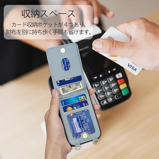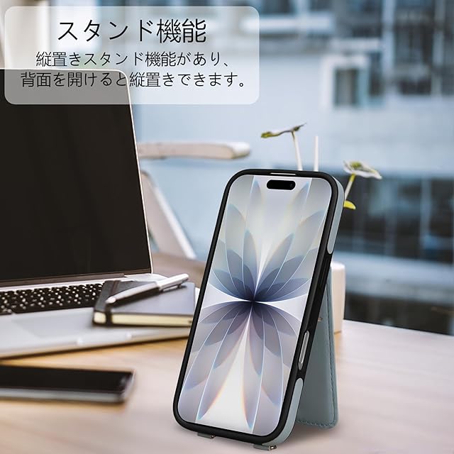 【多機能】❶ 収納機能:背面に4つのカードポケットがあり、カード、名刺、定期券、免許証、写真などを整理して持ち運べます。マグネット式開閉で、収納物が落ちる心配もありません。シンプルで便利な縦型開閉デザインが特徴です。❷ スタンド機能:縦置きスタンド機能があり、背面を開けるとビデオ通話や動画再生、レシピ閲覧などのハンズフリー操作が可能です。