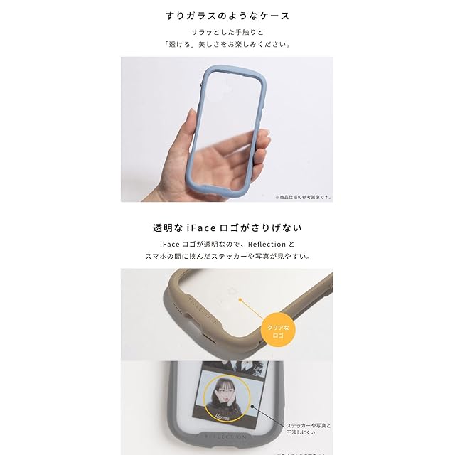 「透ける」ガラスでニュアンスを楽しむ。<br>指紋跡が残りにくい、サラサラボディのReflection。<br><br>耐衝撃性を兼ね備えたフロストガラスの透明クリアケースです。<br><br>透明度が高い強化ガラスに、柔軟さがプラスされました。<br>ポリカーボネートとの合成素材を使用することで、着脱しやすくなっています。<br>クリアで美しさが持続するReflectionケースをお楽しみください。<br><br>シグネチャーボール搭載でストラップの付け方アレンジが今まで以上に広がります。<br><br>・クリアな背面に、シールや写真を入れてカスタマイズが可能<br>・背面は指紋跡がのこりにくいサラサラしたマットタイプ<br>・ガラス飛散防止加工で、万が一の破損も安心<br>・手にしっかりフィットする「くびれ」形状で持ちやすさ抜群<br>・背面は強化ガラス、表面硬度9Hで傷が付きにくい<br>・強化ガラス複合材と弾力あるTPUで、端末をしっかり保護<br>・画面とカメラを守る、フチ高設計<br>・シンメトリーなフチ高設計で背面のガタつきを防ぐ<br>・ケースを装着したまま、サイドボタンやカメラ機能の操作がスムーズに行えます<br>・選べる2カ所のストラップホール<br>・iFaceストラップホルダー専用のクリアランス設計が施され、ショルダー使いも今まで以上に快適<br>※ストラップホルダーを併用する場合は、iFaceから発売している公式製品をご使用ください。類似品ではiFaceケースと併用の使用感をしかねるため、ご注意ください。<br><br>●本製品ご使用における人体・デジタルデバイス本体を含む持ち物・データなどの損傷、損失、紛失に対し、弊社は一切の責任を負いかねます。<br> ●使用前に記載事項を必ずご確認ください。<br> <破損や思わぬ怪我の原因となりますので以下の事項は絶対におやめください><br> ・本製品に過剰な力を加えること<br> ・本製品に破損、変形等が生じた場合の使用<br> ・火気、高温、多湿な場所での保管、長時間の放置<br> ・本来の用途以外での使用<br> ・お客様による本製品の分解、加工、改造<br> ●本製品およびパッケージは改良のため予告なく仕様を変更する場合があります。<br> ●当社の許諾なしに無断で転載、複製することは固く禁じます。<br> ●記載されている製品名・会社名などは各社の商標または登録商標です。<br> ●デジタルデバイス本体やケースに発熱などの異常がある場合は本製品を外してください。<br> ●ケースとデジタルデバイスの間に金属フィルムや金属片を挟むとワイヤレス充電時に異常発熱や機器故障の原因となることがあります。<br> ケースのカスタマイズ時には十分ご注意ください。<br> ●画面保護フィルムの形状により本製品と併用できない場合があります。<br> ●背面カメラでの撮影時に写り込みが起こる場合があります。<br> ●本製品の内側はPC素材のため、摩擦等により傷がつく場合があります。お手入れの際は柔らかい布などで優しく拭いてください。<br> ●材質の特性上、折り曲げたり強い衝撃を与えますと破損するおそれがあります。着脱の際など取扱いにご注意ください。<br> ●ご使用の充電器や環境によってワイヤレス充電がご利用いただけない場合があります。