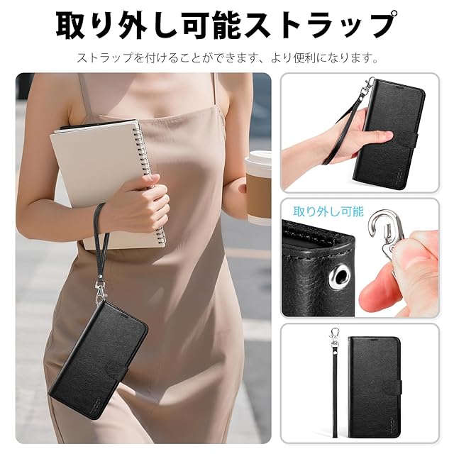 【2 in 1分離型&ストラップ付き】手帳型ケースとインナーケースは磁力で吸着され、用途に応じて簡単に取り外しが可能です。手帳型にも背面カバーにもなる便利な2in 1分離型ケースです。背面カバー単体として使用する際は、ワイヤレス充電に対応しています。手帳型ケースの上部にはストラップホールがあり、ストラップを手首に通せば、落下の心配もありません。背面カバーの下部にも縄用穴があり、お好きな縄を付けることができます。ご注意:付属のストラップは背面カバーの穴には使用できません。