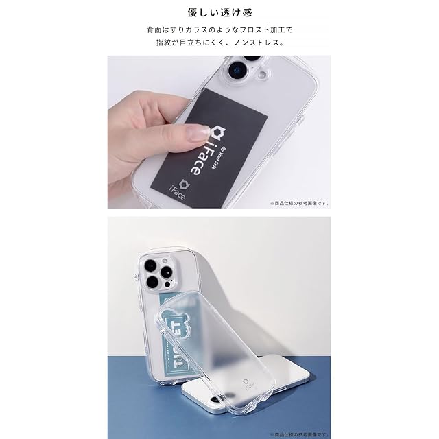 透明なだけじゃない。細部までこだわったクリアケース<br>指紋跡が残りにくい、サラサラボディのLook in Clear<br><br>全てがクリアな「iFace Look in Clear」ケースの背面がフロスト仕様になって登場。<br>半透明な背面パネルはステッカー等のアレンジも邪魔せず、自分らしいカスタマイズが楽しめます。<br>サイドはグリップ感のあるTPU素材で持ちやすく、背面は傷つきにくいPC素材でサラッとしていて指紋も目立ちにくいハイブリッドケースです。<br><br>・背面は指紋跡がのこりにくいサラサラしたマットタイプ<br>・クリアな背面に、シールや写真を入れてカスタマイズが可能<br>・手にしっかりフィットする「くびれ」形状で持ちやすさ抜群<br>・弾力のあるTPUで、端末をしっかり保護<br>・画面とカメラを守る、フチ高設計<br>・側面のドット加工で密着痕を防ぎ、見た目を美しく保つ<br>・ケースを装着したまま、サイドボタンやカメラ機能の操作がスムーズに行えます<br>・選べる2カ所のストラップホール<br>・iFaceストラップホルダー専用設計でショルダーストラップの使いやすさアップ<br>※ストラップホルダーを併用する場合は、iFaceから発売している製品をご使用ください。類似品ではiFaceケースと併用の使用感をしかねるため、ご注意ください。<br>・iFaceスマホリング、iFace画面保護シートとの併用も可能<br>※iFaceスマホリングと併用する際には一日ほど置くとしっかり貼り付きます。<br><br><br>●本製品ご使用における人体・デジタルデバイス本体を含む持ち物・データなどの損傷、損失、紛失に対し、弊社は一切の責任を負いかねます。<br>●使用前に記載事項を必ずご確認ください。<br><破損や思わぬ怪我の原因となりますので以下の事項は絶対におやめください><br>・本製品に過剰な力を加えること<br>・本製品に破損、変形等が生じた場合の使用<br>・火気、高温、多湿な場所での保管、長時間の放置<br>・本来の用途以外での使用<br>・お客様による本製品の分解、加工、改造<br>●本製品およびパッケージは改良のため予告なく仕様を変更する場合があります。<br>●当社の許諾なしに無断で転載、複製することは固く禁じます。<br>●記載されている製品名・会社名などは各社の商標または登録商標です。<br>●デジタルデバイス本体やケースに発熱などの異常がある場合は本製品を外してください。<br>●ケースとデジタルデバイスの間に金属フィルムや金属片を挟むとワイヤレス充電時に異常発熱や機器故障の原因となることがあります。ケースのカスタマイズ時には十分ご注意ください。<br>●画面保護フィルムの形状により本製品と併用できない場合があります。<br>●背面カメラでの撮影時に写り込みが起こる場合があります。<br>●ご使用の充電器や環境によってワイヤレス充電がご利用いただけない場合があります。<br>●ご利用状況・環境、溶剤の使用などにより変色や変質が起きることがあります。<br>●本製品装着やOSアップデートにより、デジタルデバイスの一部機能が使えなくなる可能性があり<br>ます。<br>●小さな部品がありますので誤飲にご注意ください。<br><br><br>商品仕様<br>17用:約縦16.1×横7.9×厚1.4cm、重量約32g<br>主素材:ポリカーボネート、TPU<br>ストラップ使用:可<br>ワイヤレス充電:可<br>:有<br>