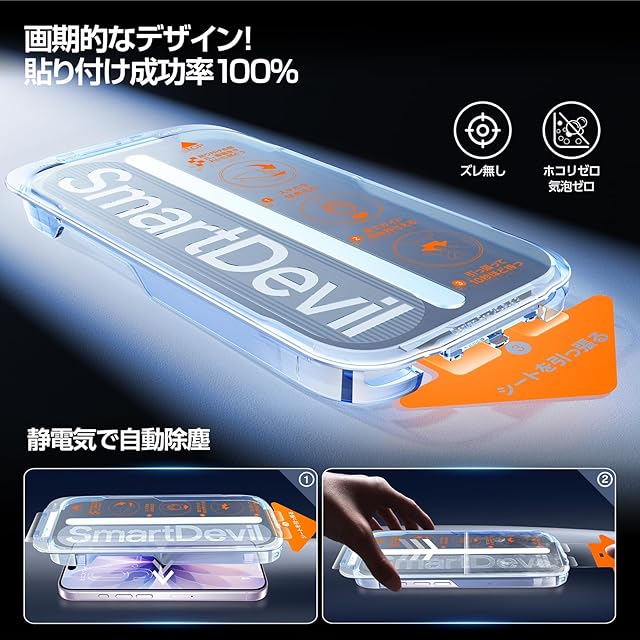 「画期的なガイド枠」SmartDevil いphone 17用 ガラスフィルム 貼り付け超簡単 0.3mm極薄 米軍MIL規格 落下保護 気泡ゼロ 覗き見防止 スムーズ 高感度タッチ 指紋防止 耐衝撃性 アイフォン 17用強化ガラス 2枚セット 1.超簡単に貼り付け:進化型ガイド枠でスマホの画面に被せてホコリ除去シートを引っ張ります。初心者でも完璧に貼り付けできます!ホコリ除去シートが自動的にホコリを吸着し、貼付け時の失敗が大幅に軽減され、より安心してご利用いただけます! 2.スマホケースと併用可能:SmartDevilのスマホ保護フィルムは、iphone 17のフルスクリーンに完璧にフィットします。100%スマホケースと干渉することなく、完全に対応しています。お客様のスマホ画面をしっかり守るできます! 商品の情報: 対応機種:iphone 17用 材料:9Hガラス 画面サイズ:6.3インチ 付属品:強化ガラスフィルム×2、進化型ガイド枠×1、取扱説明書×1 期間:365日間iphone 17 用 保護フィルム機能: 1.耐衝撃性と耐摩耗性 2.抜群な透明感 3.スムーズと高感度タッチ 4.撥水、防水、指紋防止、飛散防止 5.気泡ゼロ、ホコリゼロ、ズレセロ 6.貼り付け超簡単 Q&A: 1.上手く貼れるか心配ですが、こちら気泡が残りますか。気泡って入らないんですか。 気泡は残らない商品です。iphone 17 用 ガラスフィルムの貼り付けは、とても簡単にできます。気泡ができても慌てずにじっくりと指で押し出すだけで綺麗に貼れます。結論から言えば多少の気泡は後から擦って出せばよくそれでも多少は残りますが自然と出るようです。気泡ができた場合は指の腹でゆっくり押し出せば綺麗に抜けるので大丈夫ですよ。 2.初めて自分でガラスフィルムを貼ろうと思っているんですが、このiphone 17用 ガラスフィルムは初心者に向いているのでしょうか? 貼り付け簡単です。ガイド枠やクロスやアルコールパッド、ほこり取りシール等、十分なキットも付属品としてセットされておりました。説明書も日本語でわかりやすいです(貼り方の動画のQRコード付き)! 3.このいphone 17 用 ガラスフィルムが指紋(手垢)はどの程度残りますか? 初めのうちは全然気にならないくらい指紋はつきません。使っているうちに少しついてきますが乾拭きで消えるので問題ないです。よほど脂のついた指で触らない限り気にならないです