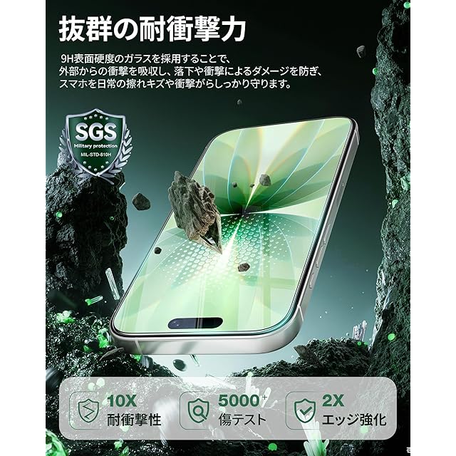 「米軍規格・傷や衝撃に強い」米軍規格「MIL-STD-810H」に準拠(認証番号SZXEC23002005001)・9H表面硬度ガラスを採用しています。アイフォン17がカバンの中で、鍵などの鋭いものにぶつかっても傷が付きにくく、スマホの画面をしっかり保護します。飛散防止加工により、万一割れてもガラス破片が飛び散ることなく安心です。