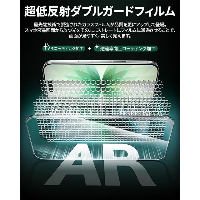 「超低反射ダブルガード・超高透過率」最先端のARアンチグレア(Anti-Reflection)コーティング技術が導入された製品が誕生いたしました。この技術は、反射光を最小限に抑えつつ、透過率を保持することで、いphone 17 画面のクリアな表示を確保しています。鮮明度や色彩表現が向上し、これまで以上に快適にご使用いただけます。また、本製品はアンチグレアの効果により、強烈な日差しや室内の照明下においても、フィルム表面の反射光を効果的に抑制します。こだわりぬいた素材と新しい技術を融合させた本製品が皆様に感動の体験をお届けします。