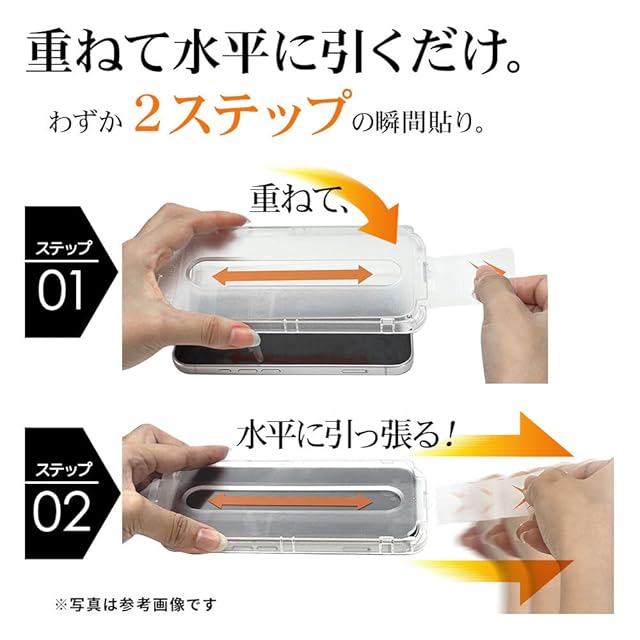 【瞬間貼り付け革命】Easy 2step!端末に付属の『はりつけツール』を重ねて、フィルムを引っ張り、中央のスキマを押して空気を抜くだけで、失敗せず簡単に貼り付ける事ができます。