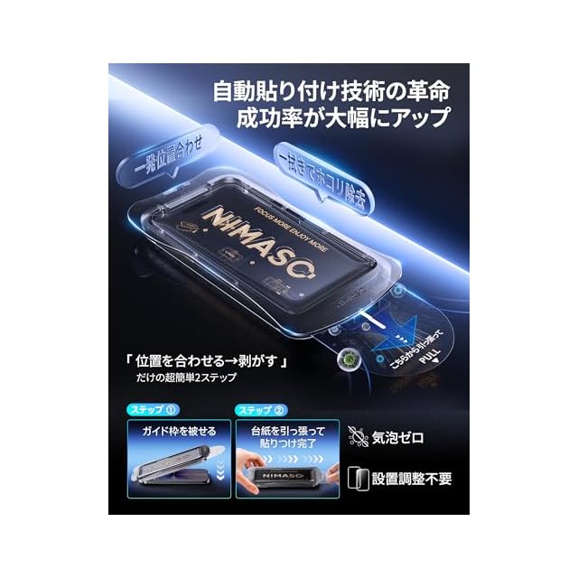 「2ステップ貼付・自動除塵」NIMASO最新の自動除塵ガイド枠が登場!!!被せる、引っ張る、たった2ステップで驚くほど簡単な貼り付け作業ができます!さらに画期的なのが、内蔵された静電式自動除塵構造。ホコリやゴミを自動的に吸着除去するので、貼り付け時の失敗が大幅に軽減します。初めての方でもストレスなく、キレイに貼れるのが特長です。もう気泡やズレに悩まされることはありません!