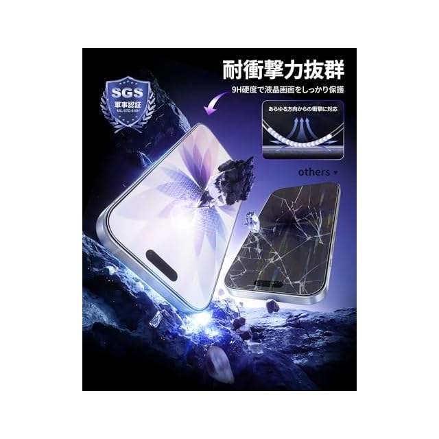「耐衝撃・飛散防止」米軍規格「MIL-STD-810H」に準拠(認証番号:SZXEC23002005001)9H表面硬度ガラスを採用しており、外部からの衝撃を吸収し、画面へのダメージを最小限に抑えます。鞄やポケットのなかで鍵などの鋭いものにぶつかっても傷が付きにくいです。飛散防止加工により、万が一割れてもガラス破片が飛び散ることなく安心して使えます。