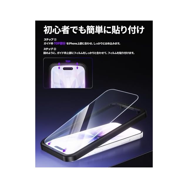 「たったの3ステップ・簡単に貼り付け」ガイド枠をはめる→上側に合わせて、フィルムを置く→軽く押すだけで自然に吸着。初めての方でも簡単に貼り付けられるよう、専用の貼り付けガイド枠を同梱しています。アイフォン17と保護フイルムがズレることなく、誰でも簡単に貼ることができます。