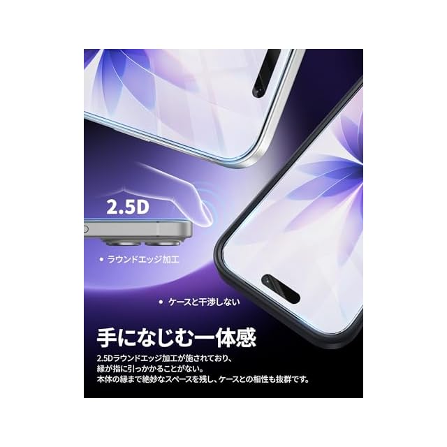 「2.5Dラウンドエッジ加工・ケースとの相性抜群」2.5Dラウンドエッジ加工が施されており、手に引っかかる感じがありません。本体の縁まで適度なスペースを残しており、装着後もスマホのデザインを損なわず、ケースとの相性も抜群です。