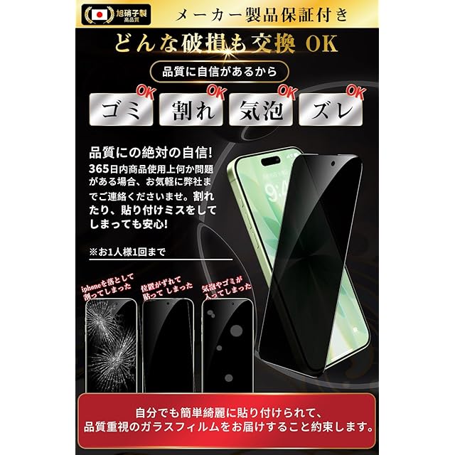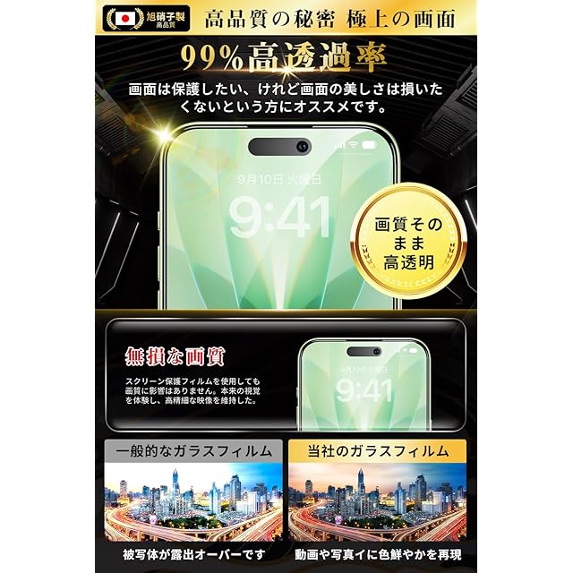 【日本旭硝子素材採用!圧倒的な耐衝撃性・飛散防止!】徹底的にこだわった品質、信頼できる日本製旭硝子素材を採用、通常ガラスフィルム などと比べ、強度、耐傷性、質感のすべてにおいて優れた性質を持ちます。安心してご使用いただけるように、一枚一枚、手作業で検品しておりました。また、17 ガラスフィルム卓越した耐衝撃性能を持って、落下への衝撃からしっかりと保護。万が一強力な衝撃でガラスフィルムが割れてしまっても、破片の飛び散りを防ぐ飛散防止コート処理で、画面をしっかり保護、スマートフォン をよく保護できます。
