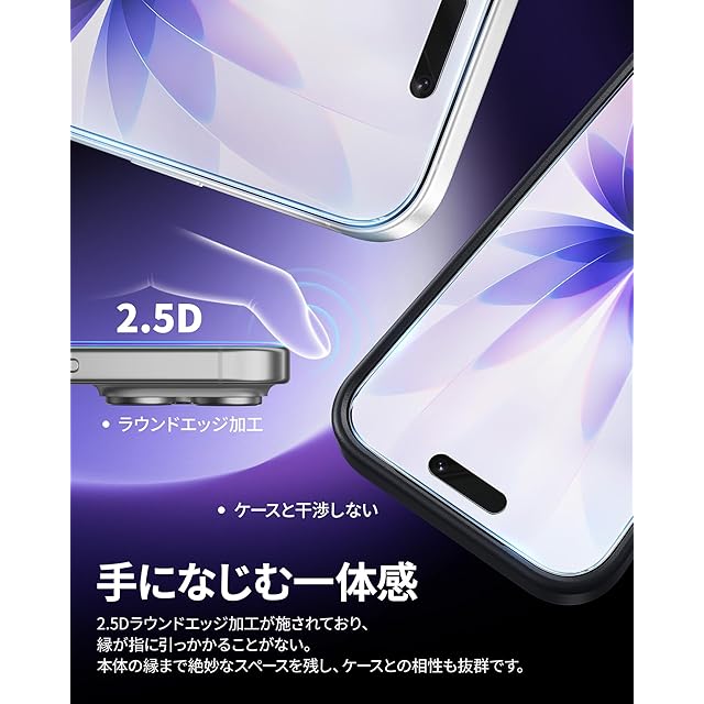 「極薄ガラス・高感度タッチ」0.33mmと薄いため、装着後の違和感も感じません。また、2.5Dラウンドエッジ加工が施されており、縁が指に引っかかることがなく、使用時の手触りも滑らか。毎日の動画視聴や仕事、勉強、ゲームなどのあらゆるシチュエーションでも、常に美しいアイフォン17の画面をお楽しみいただけます。