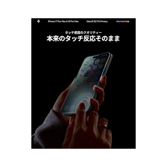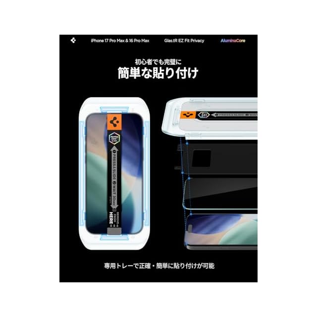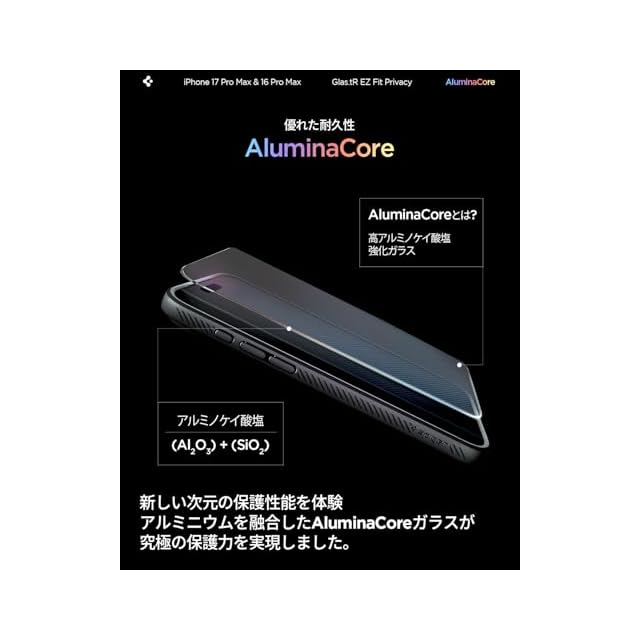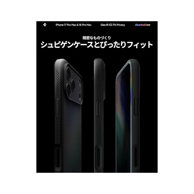 商品名:Spigen iPhone 17 Pro Max ガラスフィルム iPhone 16 Pro Max対応 覗き見防止 9H+硬度強化ガラス 米軍規格落試験済み アルミナコア 貼り付けトレイ付き プライバシーフィルム ナノコーティング 飛散防止 2枚入 EZ Fit AGL07908