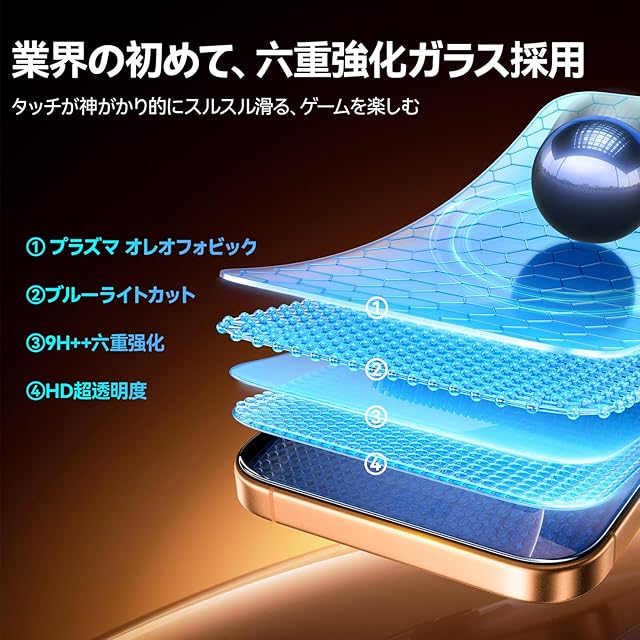 【業界初の4重強化】業界初の4重強化ガラスを採用!数千回の摩擦テストと、1.3m以上の高さからの鉄球落下テストをクリア。落下時の衝撃を大幅に吸収し、普通の強化ガラスフィルムと比べて、より耐久性に優れ、より頑丈です。万が一割れた場合でも、ガラスが飛び散ることはありません。iPhone 17 proの画面をしっかり保護します!