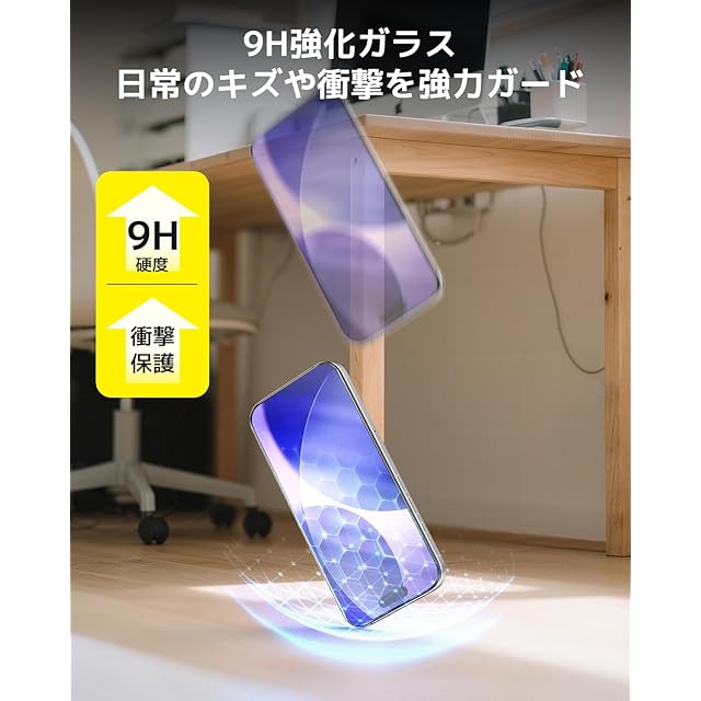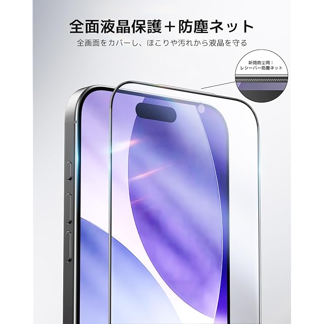 【高硬度・飛散防止・防塵ネット保護】硬度9Hの強化ガラスで日常のキズから画面をしっかり守ります。飛散防止加工により、万一割れても破片が飛び散らず安心。さらにレシーバー部分には防塵ネットを搭載し、埃の侵入を防ぎながら、音質はクリアなまま快適に通話できます。