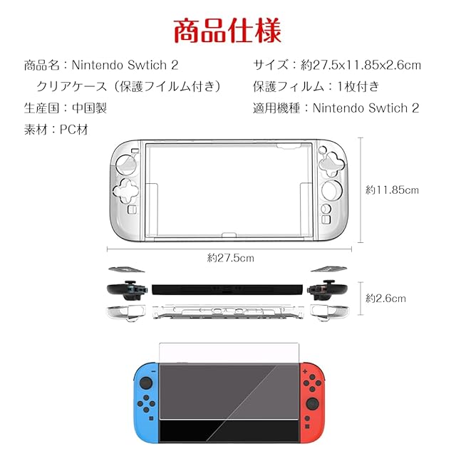商品名:Nintendo用 Switch2 用 ケース 保護カバー クリア 耐衝撃 SGS認証 直接充電可能 ドック対応 着脱不要 スタンド機能 付き 軽量 薄型 0.3mm 高透過 裸機感覚 指紋防止 防汚 抗菌 ナノコーティング 強化ガラスフィルム同梱 9H硬度 Joy-Con 対応 360度保護 衝撃吸収 携帯用 収納 便利 ニンテンドースイッチ2用