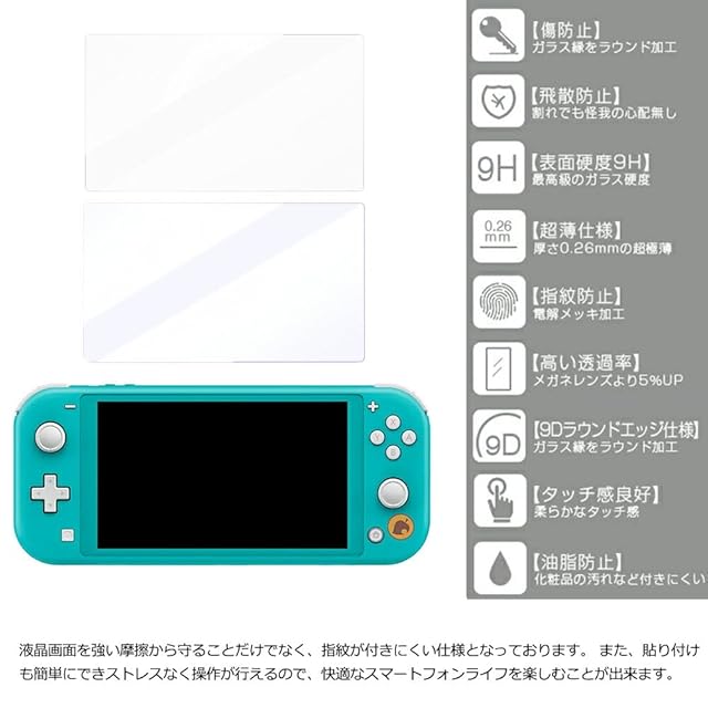 任天堂 Switch Lite 本体の液晶画面を 硬度9H 強化ガラスフィルムで保護 指紋防止 自動吸着 気泡ゼロ 飛散防止 撥水撥油 3D タッチ ガラスフィルム<br> <br> スイッチ画面をしっかり守る!2枚セットで安心! <br>ブルーライトカット機能付き高品質ガラスフィルム<br> <br> 大切なスイッチ画面を傷や汚れ、ブルーライトから守りたいあなたに、高品質ガラスフィルム2枚セットをお届けします。<br> <br> ■ 9H高硬度で安心<br> カッターやナイフでも傷がつきにくい、硬度9Hのガラスフィルムを採用。外部からの衝撃もしっかりガードし、大切なスイッチ画面を守ります。<br> <br> ■ ブルーライトカットで目の疲労を軽減<br> 長時間ゲームや動画視聴をする方でも、目の疲労を軽減するブルーライトカット機能付きです。<br> <br> ■ 高透過率で鮮明な画面<br> 光の透過率は99%と、フィルムを貼っていないような美しい画面をそのまま楽しめます。<br> <br> ■ 指紋防止・高感度タッチ<br> 指紋や汚れが付きにくく、滑らかな操作感を実現。ストレスなくゲームを楽しめます。<br> <br> ■ 2枚セットで安心<br> 万が一、フィルムが割れてしまった場合も安心の2枚セット。予備として保管しておけば、すぐに交換できます。<br> <br> <br> ■ ご注意事項<br> ※貼り付け前に、画面の汚れや油分をしっかりと拭き取ってください。<br> ※気泡が入ってしまった場合は、付属のヘラで優しく押し出してください。<br> <br> ■ 注意事項<br> ブルーライトカット効果は、100%ではなく個人差があります。<br> 画面の色味が若干変化する場合があります。<br>
