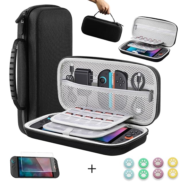 【Switch 2(2025年発売)用 収納ケースセット】Switch 2をしっかり守るため、耐久性に優れた高密度ナイロン素材を採用。汚れ・水しぶき・衝撃・擦り傷から本体を完全ガード。内側は柔らかクッション材で、優しく包み込むように保護します。 セット内容:収納ケース×1、強化ガラス保護フィルム×1、スティックキャップ×8個。