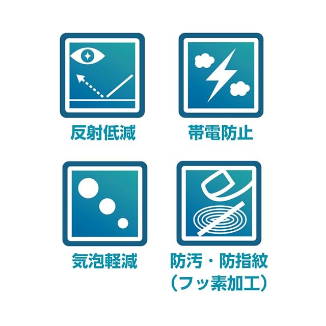 空気が入りにくく気泡が抜けやすい仕様です。フッ素加工により指紋や皮脂等の汚れが付きにくく、簡単に拭き取れます。