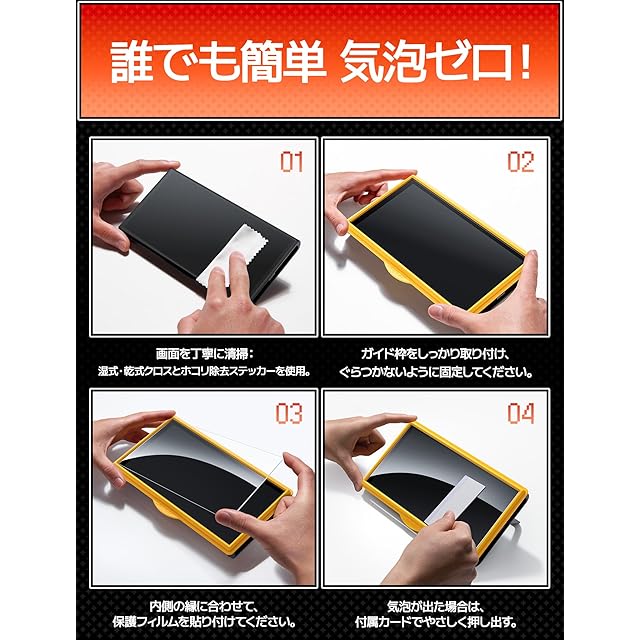 【かんたん貼り付け・気泡なし】付属の専用ガイドフレームにより、初めての方でも数秒で簡単・正確に貼り付け可能。気泡も入りにくく、すぐにゲームを楽しめます。注意:ガイドフレームをしっかり固定し、ぐらつかないようにしてください。上部または下部の内側の縁に合わせてから、貼り付けてください。短い取り付け動画を一度ご覧頂ければ、すぐに分かりますよ!