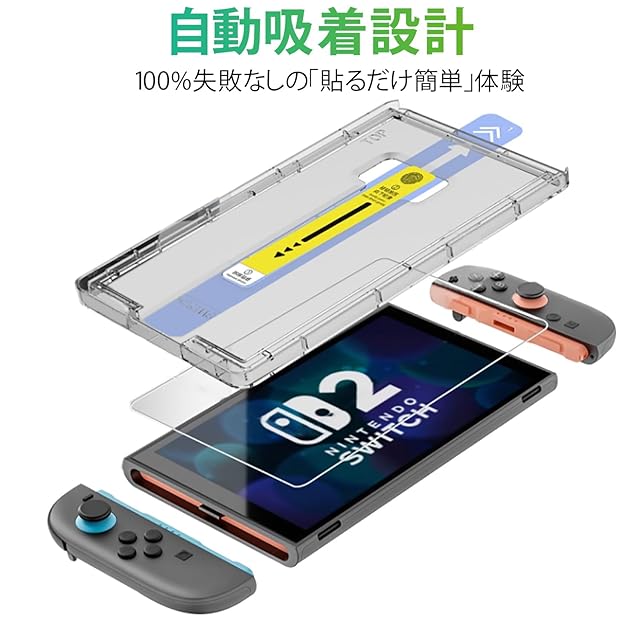LAYJOY 対応 Switch 2 ガラスフィルム【革新的なガイド枠一体式】保護フィルム 旭硝子素材製【1* フィルム+1* ガイド枠付き】耐衝撃・硬度9H 全面保護 気泡レス 自動吸着 貼りやすい 超鮮明な画質 高光沢 目に優しい 指紋防止 飛散防止 スクラッチ防止
