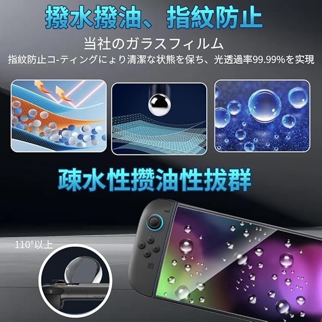 「指紋防止 / 防水 / 耐油性 の効果非常によい 」:当社の で、通常の フィルム のようなラフなタッチは一切ありません。更に超指紋防止、汗防止、スムーズにゲームプレイ体験、長時間の楽しみなどの利点もあります。10,000回以上に摩擦しても、指紋が残らなく、表面に滑らかで 防水性に優れ、油防止に優れて 、 水滴はボール形のままに保持します。(付着した指紋、水滴、汗、化粧品などは簡単に拭き取れます)