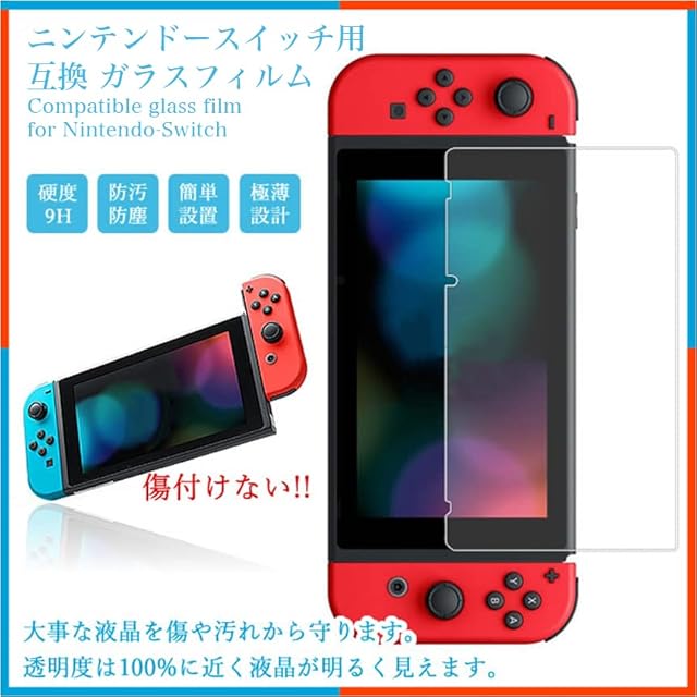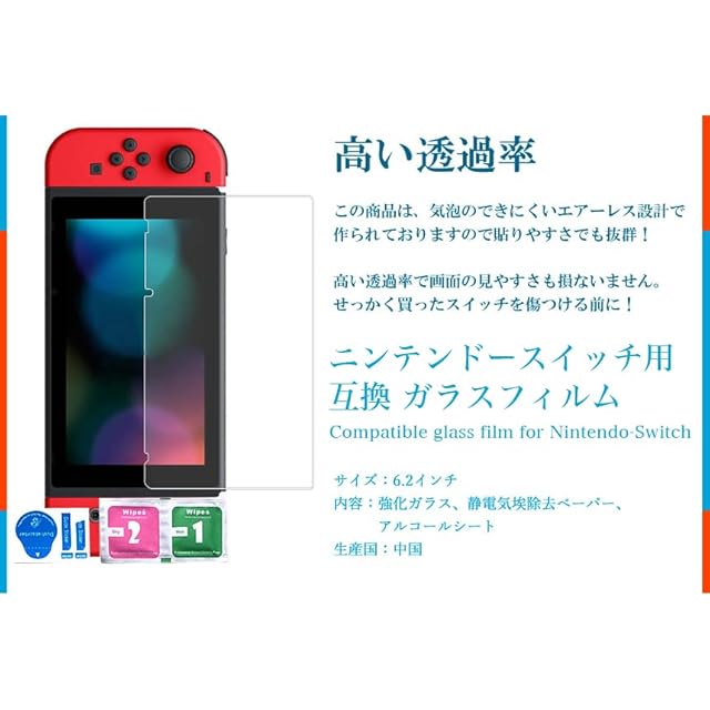 せっかく買ったスイッチを傷つける前に!<br><br>美しい液晶画面を保護<br><br>愛用のスイッチのキレイな液晶画面に 傷やホコリなど、<br>汚れが着いてしまうのを防止します<br><br>表面硬度9Hで、カッターの刃も受け付けないほど丈夫です<br><br>この商品は、気泡のできにくいエアーレス設計で 作られておりますので<br>貼りやすさでも抜群! <br><br>高い透過率で画面の見やすさも損ないません。<br><br><br>サイズ:6.2インチ<br><br>内容:強化ガラス、静電気埃除去ペーパー、<br><br>アルコールシート<br><br>生産国:中国<br><br><br>※当商品には本体及びソフトは付属しておりません。<br>※こちらの商品は純正品ではありません。<br>※実際の商品と画像は若干異なる場合がございます。