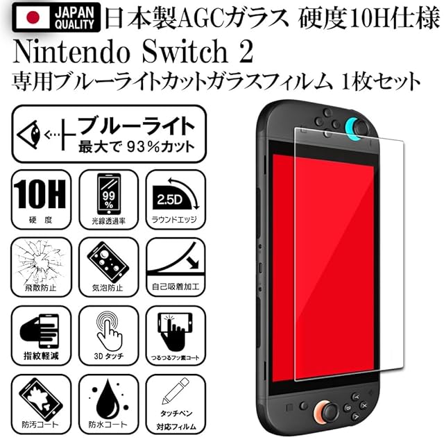 <p>アフターフォローアフターサポートも安心の<br> 日本法人 RISE PRODUCTS ブランド<br> 硬度10H 第3世代 W硬化製法(二次強化)済 <br> 国産AGCガラスを使用したブルーライトカットガラスフィルム 。<br> ガラスフィルム1枚セット 。<br> <br> ※ご注意ください ブルーライトカットガラスは太陽光の下では青く反射します、 その為、使う方によっては画面が見えずらい場合がございます。 日中太陽光が当たる屋外での使用頻度が多い場合は ブルーライトカットタイプではなくクリアタイプをお勧めします。<br> <br> ■対応機種:Nintendo Switch2 / スイッチ2<br> <br> 【製品仕様】<br> <br> ■安心の日本製素材 国産AGCガラスを使用。<br> <br> ■ブルーライトを93%カットする素材を使用。<br> <br> ■第3世代製法の最新技術のW硬化製法(2次強化)ガラスで耐衝撃性を強化。<br> <br> ■ガラス表面に400度の高温処理を6時間かけた強力コーティングを実現。<br> <br> ■フィルムが破損しても飛散防止加工で液晶画面を徹底保護。<br> <br> ■第3世代製法の最新技術のW硬化製法(2次強化)ガラスで対擦傷性を強化。<br> <br> ■透過率99%で液晶の鮮やかな画面をそのまま表現。<br> <br> ■耐指紋軽減加工により、汚れてもさっとふき取るだけで元どうりに。<br> <br> ■撥油撥水コーティングで汚れを弾き、長期間のコーティングを維持。<br> <br> ■気泡ゼロ、フィルムを位置に合わせておくだけであっという間に自動で吸着。<br> <br> ■柔軟性のある3Dシリコンが快適なタッチ感度を提供。<br> <br> ■5層のフィルム設計で強度のある0.33mmのガラスに仕上げました。<br> <br> ■充実した付属品、専用動画で簡単貼り付けが可能。<br> <br> ■万が一貼り付けに失敗しても安心のお届け後15日間の貼り付け付き。<br> <br> ■内容品<br> <br> ガラスフィルム ×1、ウェットワイプ×1、ドライワイプ×1、埃吸着シート×1、クリーニングクロス×1、パッケージ裏面貼付説明書付属。<br> <br>