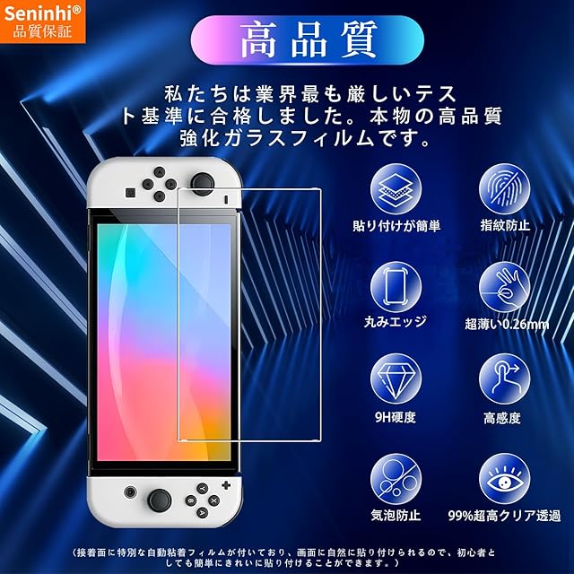 <p>対応 Nintendo Switch 第2世代 専用フィルム</p> <p> 特徴 </p> <p>1.【硬度9H】</p> <p>ハードコーティング技術採用、9H超硬質ガラスで作られ、25ポンドの耐力試験に合格して、耐久性いい。</p> <p>カッターなどの鋭利なものを当てたとしても損傷なく使用することが出来ます。</p> <p><br></p> <p> 2.【飛散防止】</p> <p>万が一の破損時も飛散防止加工によって破片はフィルムに張り付いた状態で90%以上飛び散らないです。</p> <p>万一このフィルムに非常に強い力が加えられた場合でも、小さく尖った破片に砕け散ることはなく、</p> <p>お持ちの端末やご自身へ危険を回避できます。</p> <p><br></p> <p> 3.【気泡防止】</p> <p>誰でも簡単に、気泡のない仕上がりへ。ガラスフィルムは自動吸着なので、貼り付ける時にラクラクにできます。</p> <p><br></p> <p> 4.【高透過率】</p> <p>99%高透過率。高級感のある映像を演出する高透過率のフィルムなので、撮った写真や動画、</p> <p>ゲームなどを高画質のままお楽しみ頂けます。</p> <p><br></p> <p> 5.【指紋防止】</p> <p>ガラスフィルムは疎油性コーティングがされているため、指紋を防ぎ、美しい画面で滑らかで快適な操作が可能です。</p> <p> 4つ簡単な手順: </p> <p>1、アルコールをつけた雑巾でスクリーン表面の油、指紋などを拭き、その後、スーバーファイバーの乾いた布でスクリーンをさらにて徹底的にぬぐい取ってください。 </p> <p>2、フィルムを対応する位置に貼り付け、ガイドのラベルで貼り付けどころを固定ください。 </p> <p>3、フィルムを反転して、無塵まで二回面に除塵布でスクリーンを拭きます。 </p> <p>4、フィルム裏の膜を剥がす、フィルムをそっと押して、自動的に吸収した後、気泡をすっかり取り除きます、バッチリ完璧に完了。</p> <p> </p> <p><b>パッケージ内容 </b></p> <p> 2 × 強化ガラスフィルム</p> <b>1 × 取扱説明書</p> <b>2 × スクリーンクリーニングキット</p><b> 2 × ホコリ除去用ステッカー</p>1×ガイド枠<b></p> <p><b>品質 商品到着後、不具合(割れ・キズ・汚れ等)がございました場合、弊社とご連絡ください。対象となりますので放心してお買い求めください。</b><br></p>