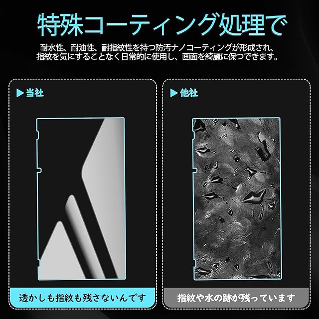 【指紋防止、高感度タッチ】ガラスフィルムには撥油コーティングが施されており、指紋や汚れなどに強くなめらかな操作感を実現、付着した汚れなどは簡単に拭きとれます。こちらは高耐久撥油コーティングが施され、つるつるな滑り感を実現!ゲームしても渋くなし!