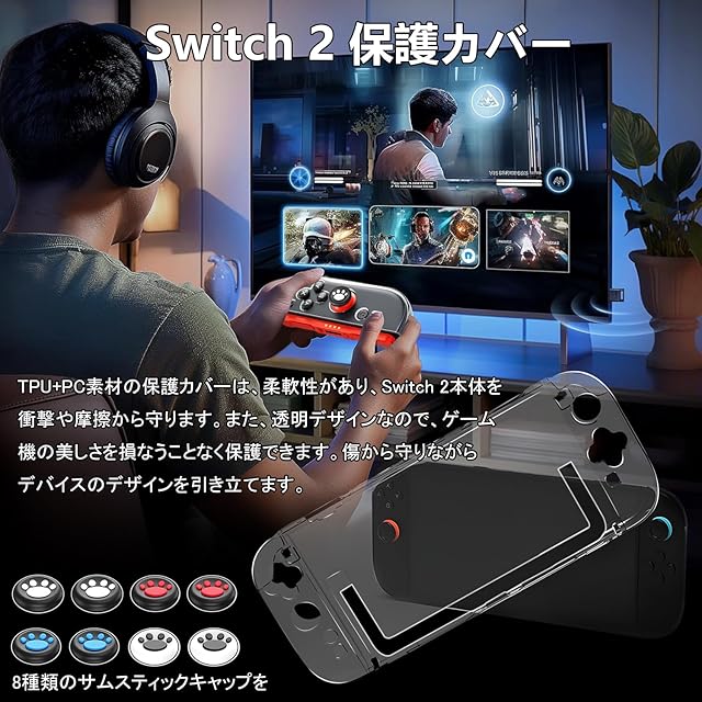 【Switch2 保護キット ドック対応】Switch2専用。パッケージ内容:Switch2透明ケース*1、Switch2保護フィルム*2、Switch2スティックキャップ*8。Switch 2専用のPC+TPU製保護ケース、に100%密着設計。分離式構造により、ゲームカード交換・充電操作を阻害しません。各ソケットから穴を設置していて、ゲームのボタンに邪魔せず、本体と合一になります。Switch 2の寿命を延ばします。本製品はNintendo Switch 2(2025年発売)のみ対応しております。旧モデルには対応しておりませんので、購入前に必ずご確認ください。 【Switch 2 保護カバー 分体式設計】当社独自開発の新技術により、黄ばみ防止性能を大幅向上。高透明度の高品質PCカバー+ TPUグリップカバー素材を採用、長時間使用後も輝きと透明感を維持し、Switch2本来の美しさをキープ! 抜群の手触りと耐久性を実現。このswitch 2保護カバーは、精密なに基づく設計された円弧は、装着後しっかり本体に装着し、Switch 2 本体が落ちる心配一切ありません。透明度の高いSwitch 2が360度からの衝撃を守り、落下によるダメージも緩和できます。高い防塵、傷防止、耐衝撃性、防指紋、散熱加工の超薄型、軽量ケース。