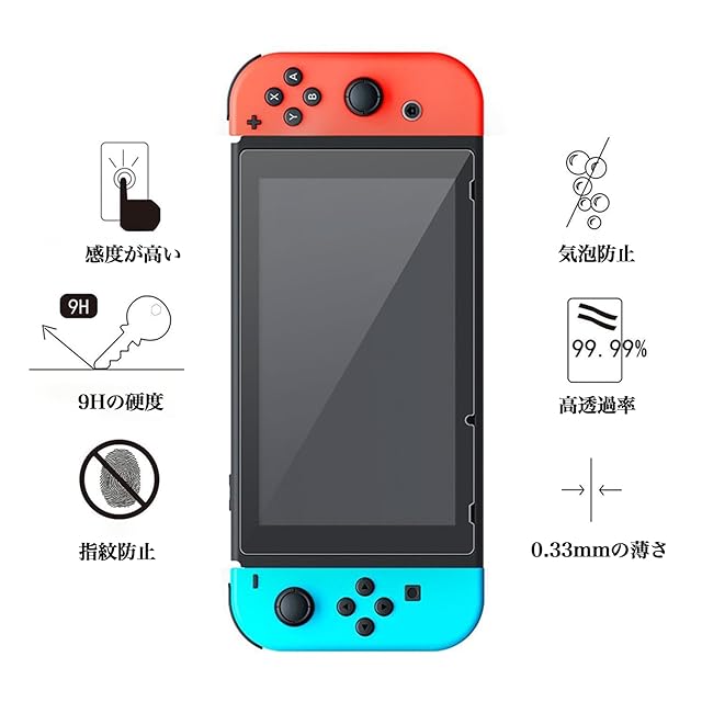<p>このSwitch用保護フィルムは、お得な2枚セットで長期間使用することができます。付属のアルコールシート、ドライシート、ホコリ取りシールも含まれており、簡単に貼り付けることができます。</p><p><br></p><p>0.33mmの薄型設計で、Switchのタッチスクリーンの感度に影響を与えることなく、スムーズにドックに設置することができます。また、99.9%の高い透過率を誇り、元々の画面の色鮮やかさを損なわず、高い透明度を保ちます。</p><p><br></p><p>さらに、気泡や指紋の心配もありません。自動吸着機能により、簡単にフィルムを貼り付けることができます。さらに、特殊なコーティングにより、水や汚れ、指紋などを簡単に拭き取ることができます。</p><p><br></p><p>Switchの画面をしっかりと保護するために、このフィルムは9Hの硬度を持ち、日本製の旭硝子ガラスを採用しています。ナイフを当てても傷がつきにくいため、日常の使用でも安心して利用することができます。</p><p><br></p><p>Switchユーザーの皆様にぴったりな高品質な保護フィルムをぜひお試しください。Switchを美しく、長くお楽しみいただけます!</p>