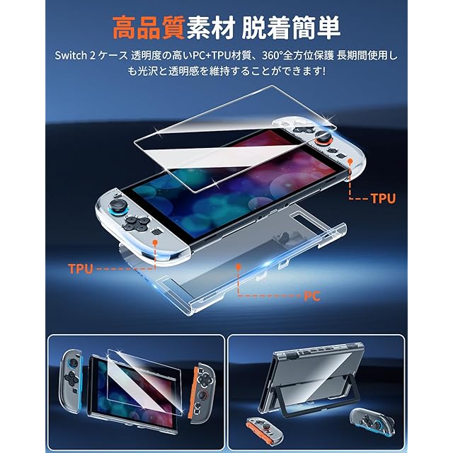 【高品質PC+TPU素材】:本製品は優れたPC+TPU製超薄型素材を採用し、ケースは硬質プラスチック素材で作られており。99%透明、シンプル、Switch 2の本来の美しさを誇示します。着脱が簡単です。
