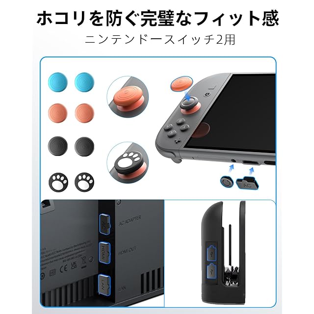 Switch 2(2025年モデル)に完璧対応:ぴったり設計でブレなし収納 新型Switch 2専用に精密設計されたケースで、本体をジャストフィット。外出時も本体が動かず、3Dスティックや画面をしっかりガードします。 加厚ABS+PCハードシェル:EVA素材を凌ぐ防圧性能 高強度ABS+PC素材で構成されたシェル構造は、従来のEVAケースを超える耐久性と耐圧性能。衝撃や落下から本体を強力に保護します。 ジョイスティックを潰さない立体保護設計 内部に厚みと隆起構造を採用し、3Dスティックに圧力がかからない設計。バッグの中でも押される心配がなく、安心して持ち運べます。 ケースを閉じたまま充電OK|薄型&軽量で持ち運びラクラク ケース側面に充電用スリットを備えているため、収納したままでも充電可能。超薄型&軽量設計で、日常の持ち歩きや旅行に最適です。 フルセット内容で安心:ガラスフィルム×2・キャップ×8・ダストプラグ 高透過強化ガラスフィルム(2枚)、滑り止め付きスティックカバー(4デザイン×2)、ポート保護用ダストプラグ付き。Switchをトータルで守るフルセットです。