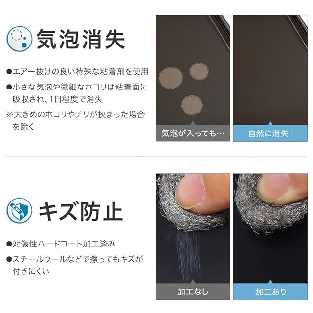 本製品は、反射防止加工を施したアンチグレアタイプの保護フィルムです。蛍光灯の光や窓からの映り込み、周囲の景色の反射を軽減し、画面の視認性を高めます。室内はもちろん、屋外での使用時にも快適な視認性をサポートします。 さらさらとしたマットな質感で、指すべりが良く、快適なタッチ操作が可能です。指紋や皮脂汚れが付きにくいため、画面を清潔に保ちやすいのも特長です。 貼り付け作業をサポートする自己吸着型の特殊粘着素材を採用。小さな気泡であれば時間の経過とともに自然に吸収・消失するため、初めての方でも簡単に貼り付けが行えます。万が一、気泡が残ってしまった場合でも、約1日程度で自然に消えることがあります。※ただし、大きな気泡は消えない場合があるため、あらかじめ指で押し出してください。 貼り直しも可能な仕様で、位置の微調整も安心して行えます。貼り直す際は、カメラレンズ用保護フィルムの剥離フィルムなどをご活用ください。気泡が消えにくい場合は、指の腹でやさしく擦ることで改善されることがあります。また、気泡の原因がホコリである場合は、セロハンテープなどで取り除いてください。 【ご注意】 ・記載されている会社名・製品名・ロゴは、各社の商標または登録商標です。 ・商品の仕様や外観は、予告なく変更される場合があります。 ・掲載の画像やイラストはイメージです。 ・本製品は日本国内で製造されています(Made in Japan)。