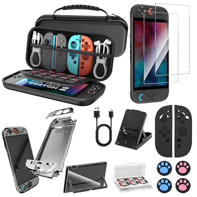 【Switch 2専用&アクセサリー収納ボックス】2025年発売のSwitch 2専用に設計された保護収納バッグです。ぴったりフィットする溝設計で、Switch 2を安全に保護します。広々としたデザインで、本体だけでなく、ゲームカード、データケーブル、ヘッドホンなどのアイテムも収納できます。セット内容:Switch 2専用収納ボックス、9H強化ガラススクリーンプロテクター2枚、取り外し可能なPC保護ケース1個、TPUコントローラー保護ケース2個、サムキャップ4個、シリコンコントローラースリーブ2個、予備データケーブル1m、Switch 2専用折りたたみスタンド1個、ゲームカートリッジ収納ボックス1個。