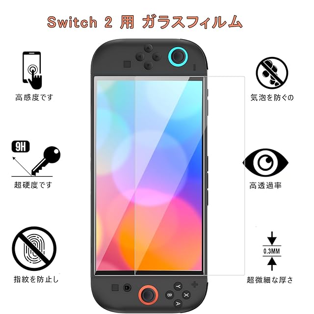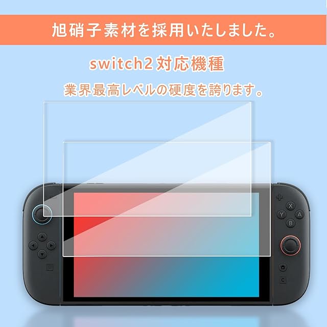商品名:Xunbida For Switch 2 用 ガラスフィルム 強化 ガラス 保護 フィルム 目の疲れ軽減 日本旭硝子素材 高透過率 強靭9H 撥水撥油 指紋防止 飛散防止 気泡ゼロ 貼り付け簡単 親指グリップキャップ*2個付き(2枚入り)