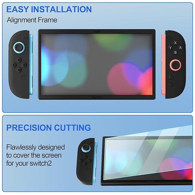 【取り付けアライメントフレーム】取り付けを容易にするために、アライメントフレームも付属しています。 Nintendo Switch 2 強化ガラスを位置合わせフレームに沿って置き、数秒で簡単に取り付けます。