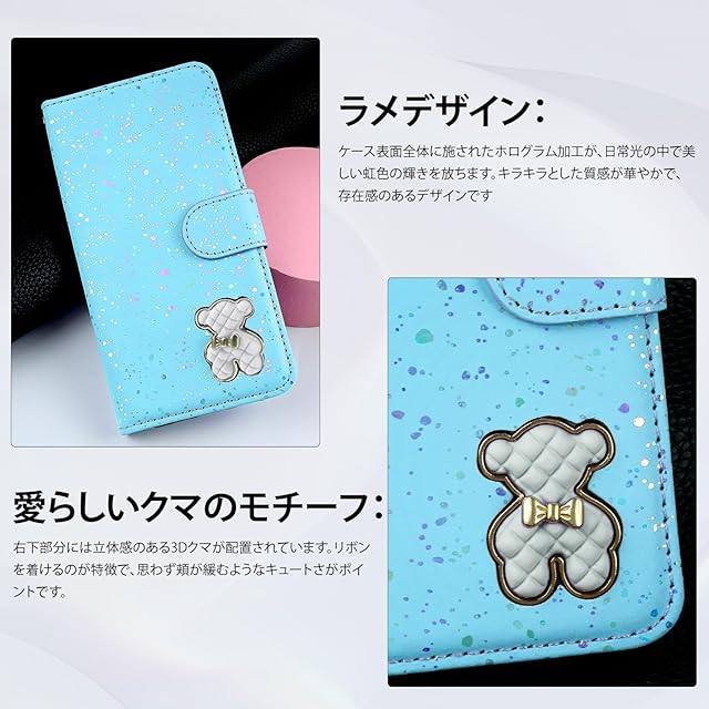 【高級感あふれるデザイン】虹色に輝くレーザーポイント&立体クマチャーム:表面にランダム配置のレーザーポイントを施し、光の角度で七色に変化。右下の立体リボンクマチャームが愛らしさをプラスし、日常使いから特別な日まで幅広く活用可能。aquos sense3 ケース sh-02m ケース aquos sense3 basicケース