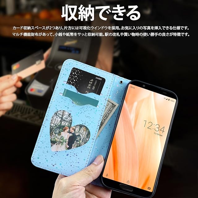 【収納力&パーソナライズ】3-in-1多機能仕様:内側に2つのカードスロット(最大2枚収納)と札入れを配置。ハート型の透明ウィンドウ付きスロットで、お気に入りの写真やメッセージカードを展示可能。shv48 ケース aquos sense3 lite ケース aquos sense3 ケース 手帳型 aquosセンス3 ケース