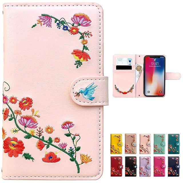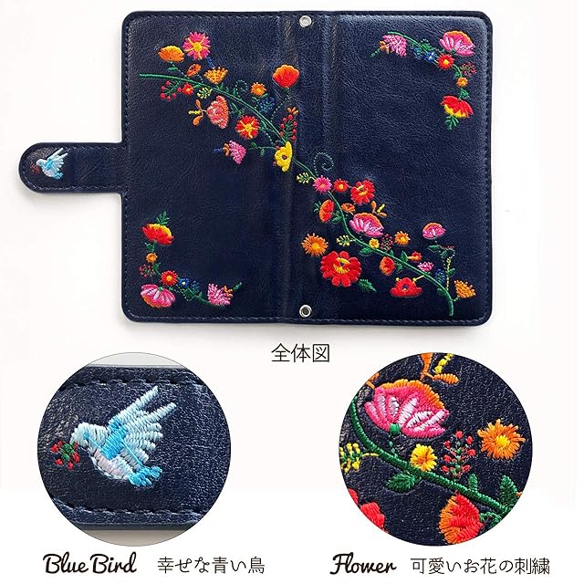 少しレトロで可愛い花の刺繍を施した手帳型ケースです。ハンド部分の青い鳥がワンポイント!内側ポケット部分にも刺繍を施しております。・内側は黒色のTPUケースにより、本体を固定し、保護します。・ケースは一つ一つ手作りで作成しております。・ハンドの部分はマグネットを使用しております。