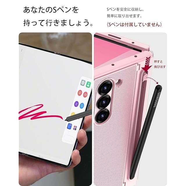 【Sペン収納&スタンド機能】Sペン収納。押し下げると Sペンが出て、引き上げると固定されます、Sペンの取り入れは簡単です、そしてもSペン内蔵収納して、sペンなくでも、全体はオシャレです。ケースは折り畳んでスタンドにできます、動画鑑賞やビデオ会議などを楽しめます。(※スタンド角度に限りあり。無理に開けない。壊れる恐れあり。ペンスロットは Z Fold 5/6 S Pen Fold Edition 専用。ペン不付属。他スマホモデル、Z Fold 3/4/5 非対応)