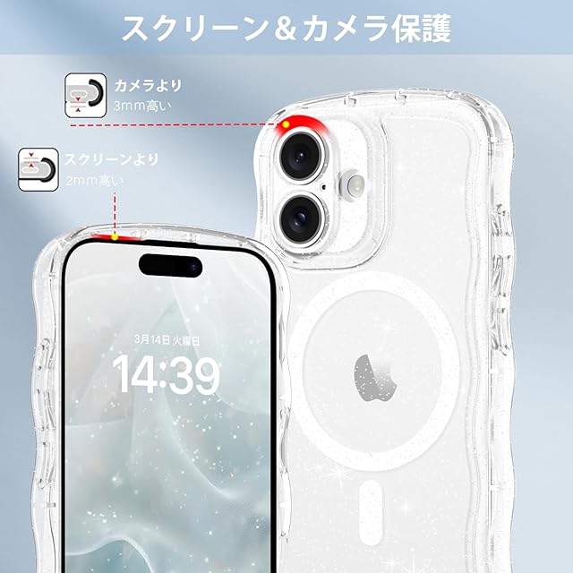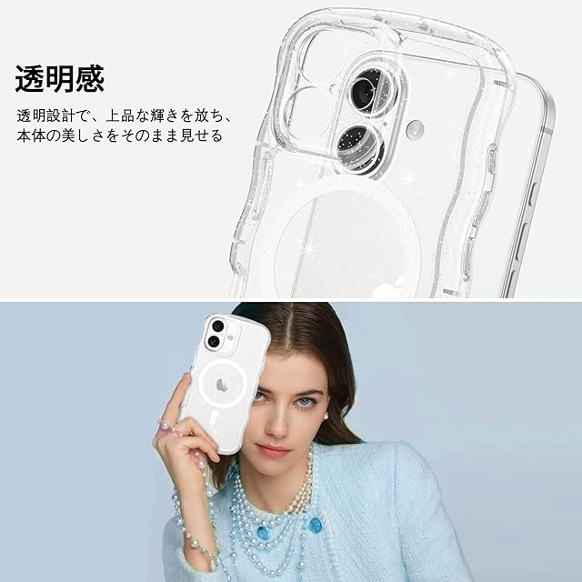 商品名:VENINGO 対応 いPhone17ケース Magsafe対応 ウェーブ グリッター かわいい 韓国 透明 ストラップホール付き ワイヤレス充電対応 耐衝撃 可愛 おしゃれ 黄変防止 全面保護 スマホケース アイフォン17カバー 6.3インチ キラキラ クリア