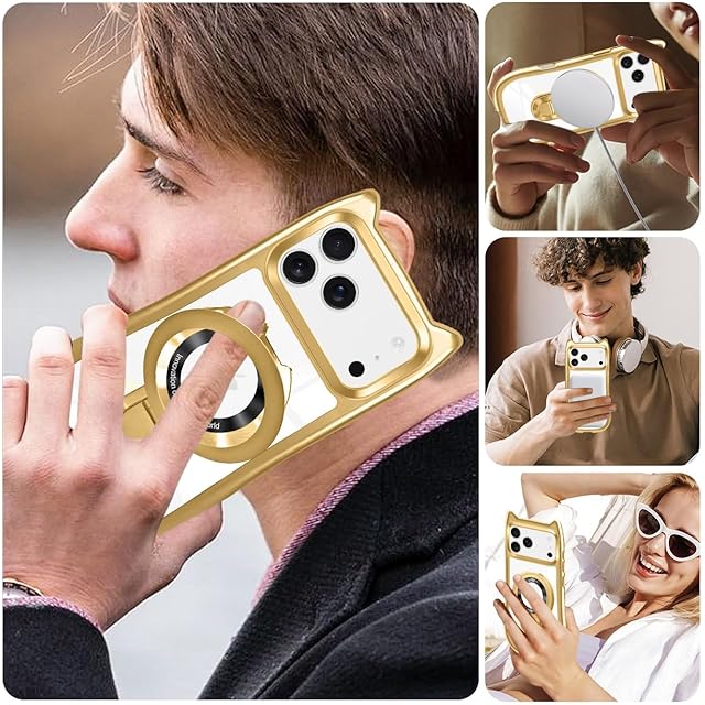 iPhone 17 Pro ケース 猫耳 クリア 薄型 いphone 17 pro カバー 軽量 MagSafe対応 ワイアレス充電 TPU 韓国 ねこ アイフォン17 pro 携帯ケース リング付き 磁力強 多機能 スタンド 転倒防止 かんしょうほご 耐久性 黄変防止 ひっかき防止 やわらかい ポータブル めっき加工技術 (ゴールド)