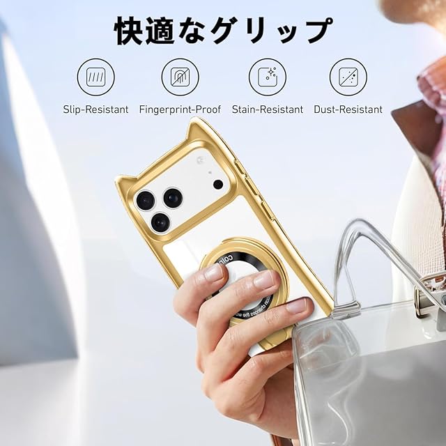 商品名:iPhone 17 Pro ケース 猫耳 クリア 薄型 いphone 17 pro カバー 軽量 MagSafe対応 ワイアレス充電 TPU 韓国 ねこ アイフォン17 pro 携帯ケース リング付き 磁力強 多機能 スタンド 転倒防止 かんしょうほご 耐久性 黄変防止 ひっかき防止 やわらかい ポータブル めっき加工技術 (ゴールド)