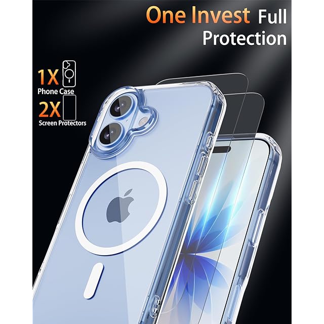 Yunjews iPhone 17 用 ケース クリア MagSafe対応 強化ガラススクリーンプロテクター2枚 黄ばみ防止 ミリタリーグレード耐衝撃 スリム軽量保護電話カバー 6.3インチ 透明