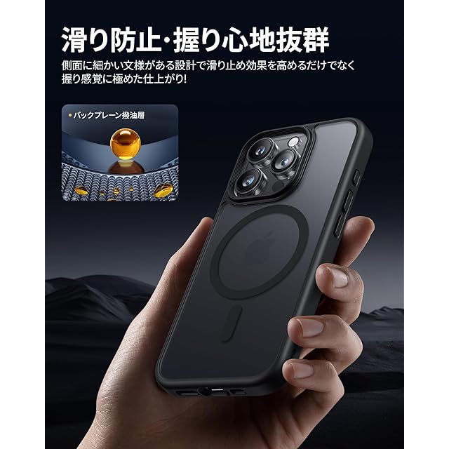 【半透明・マットな仕上げ】背面のポリカーボネートは、耐久性や耐摩耗性に優れ、マットな質感でサラサラして触り心地がすごく良いです。表面には指紋防止ナノオコーティングを施しており、指紋つく心配はありません。